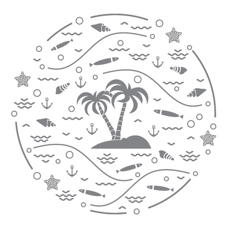 かわいいベクター イラスト魚 島のヤシの木 アンカー 波 貝殻 ヒトデ 円形に配置 横断幕やポスター印刷のデザイン のイラスト素材 ベクタ Image