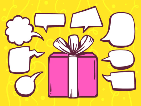 ピンク柄の背景に吹き出し漫画とギフト ボックスのベクター イラストです ラインの Web サイト 広告 バナー ポスター 掲示板やプリントのアート デザイン のイラスト素材 ベクタ Image